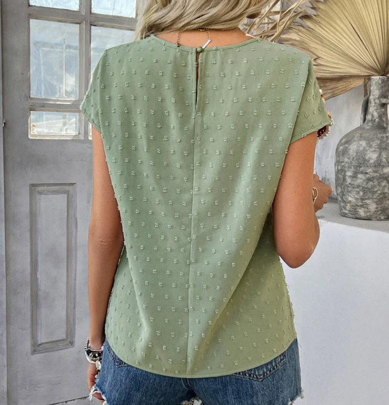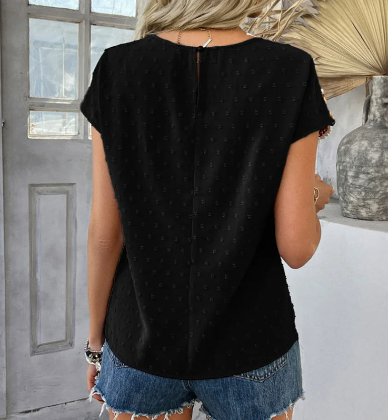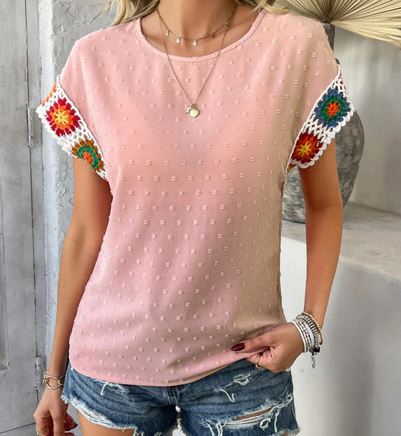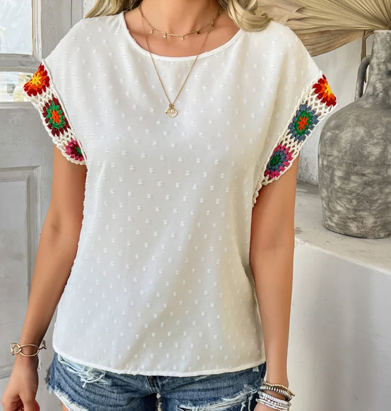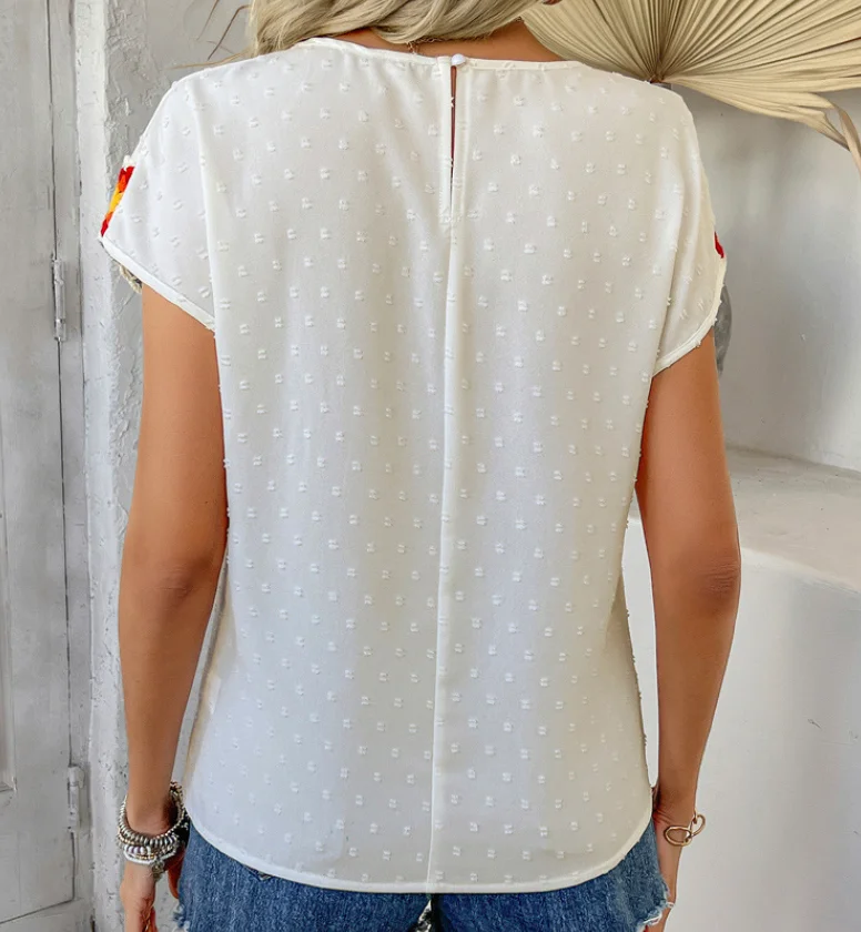 Women’s T-Shirt Casual Color Blocking Vacation Polka Dot Embroidered Short Sleeved Top Shirt Simple Commuting Retro T-Shirt