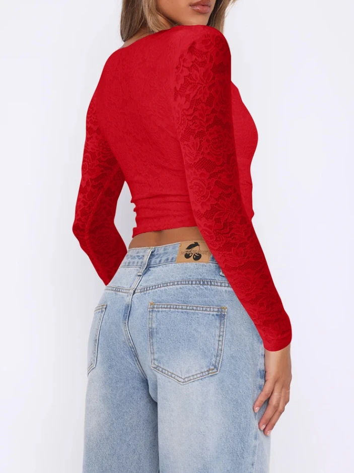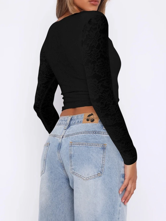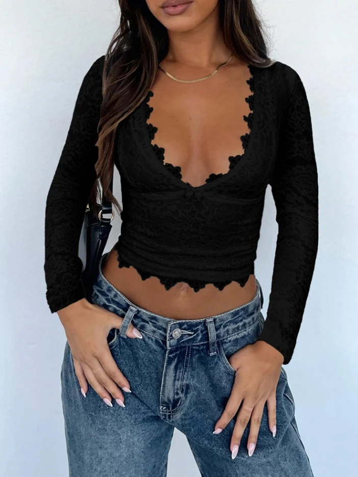 Women's fashionable and sexy deep V-hollow sweet and spicy lace pullover top for autumn 2025 new women's clothing