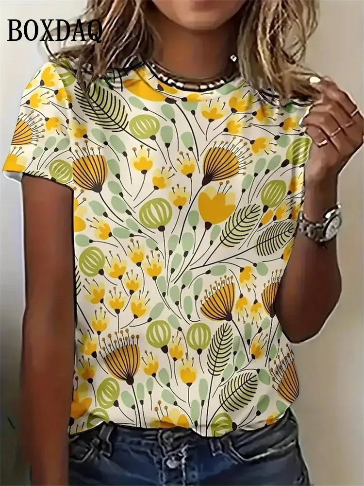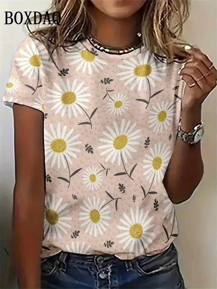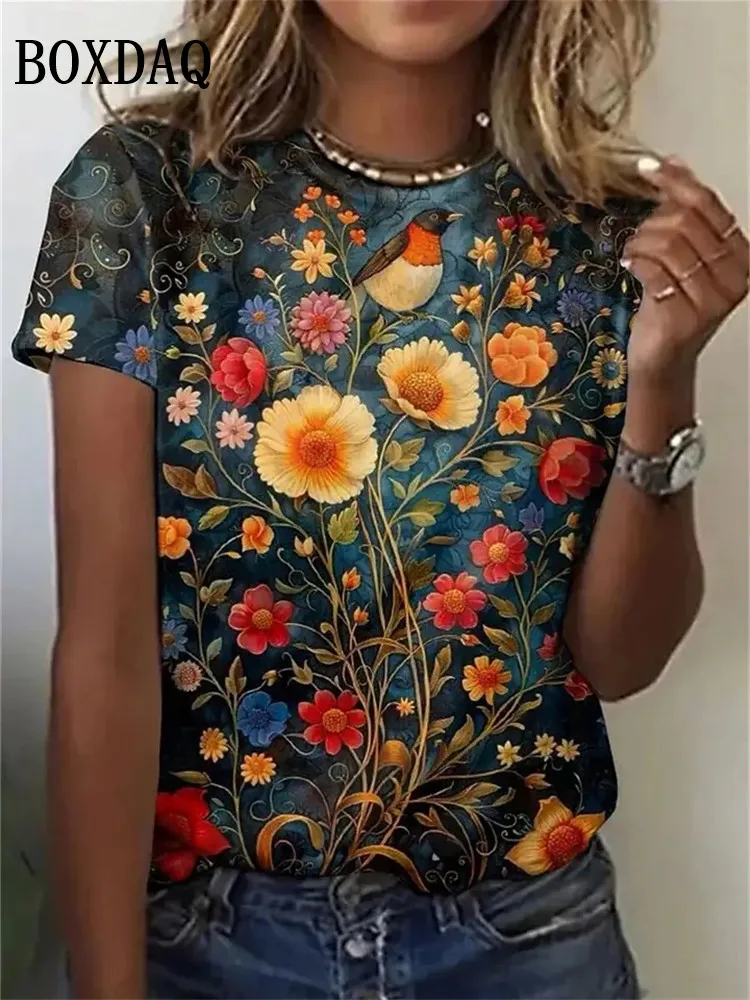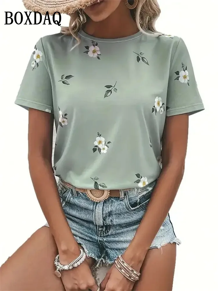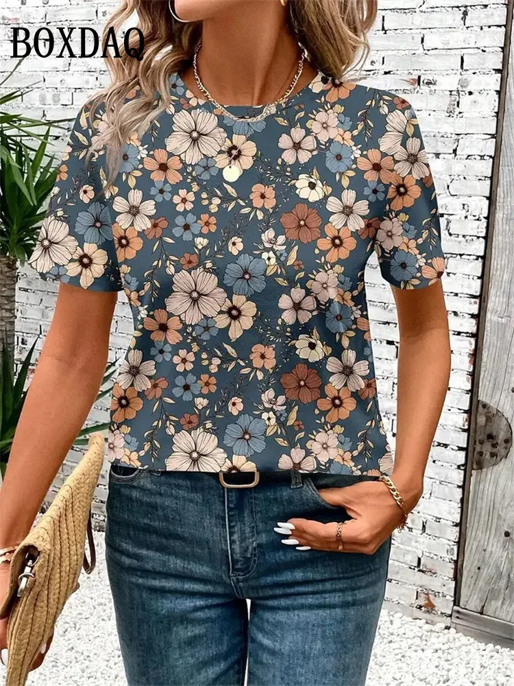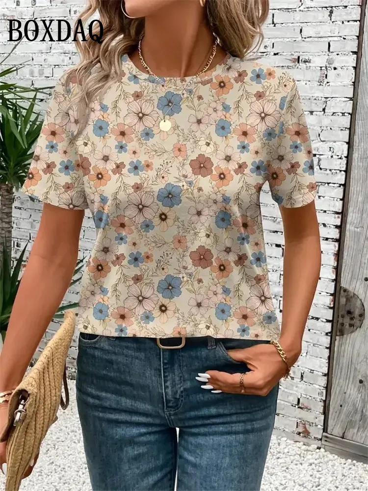 Women’s T-shirt Casual Round Neck Short Sleeve Top Summer Outdoor Street Fashion Famale Oversize Clothing Floral Print T shirts